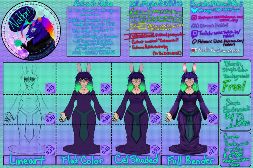 Hi there Guys, Gals and Nonbinary-Pals, My name is Nebbri (They/Them), I am an artist that specializes in Furry and General Character Creation along with Logos, Emotes, and much more! Recently I've gotten heavily into drawing FFXIV Characters! If you're interested in commissioning me please contact me or my manager/husband at one of my social media links or our Discords listed below!My Discord: nebbri