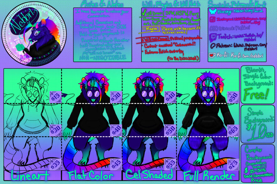 Hi there Guys, Gals and Nonbinary-Pals, My name is Nebbri (They/Them), I am an artist that specializes in Furry and General Character Creation along with Logos, Emotes, and much more! Recently I've gotten heavily into drawing FFXIV Characters! If you're interested in commissioning me please contact me or my manager/husband at one of my social media links or our Discords listed below!My Discord: nebbri